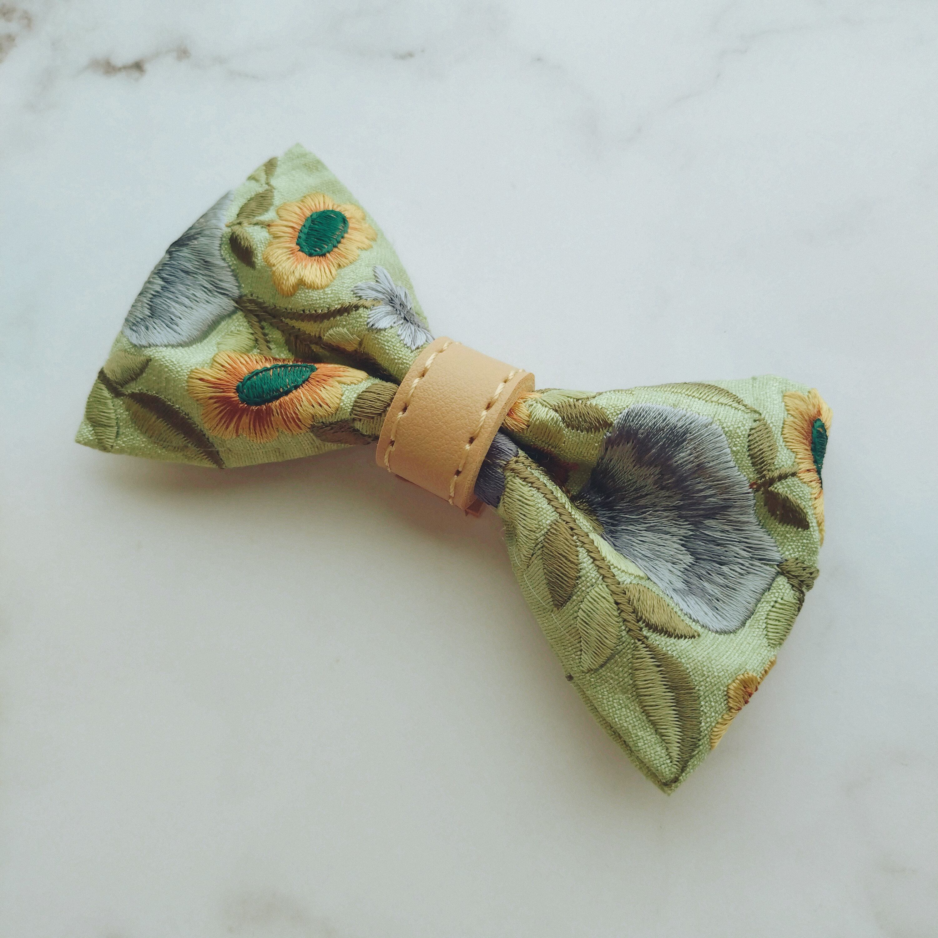 シルク素材のライトグリーンの生地にブルーやイエローの刺繍が鮮やかな蝶ネクタイ