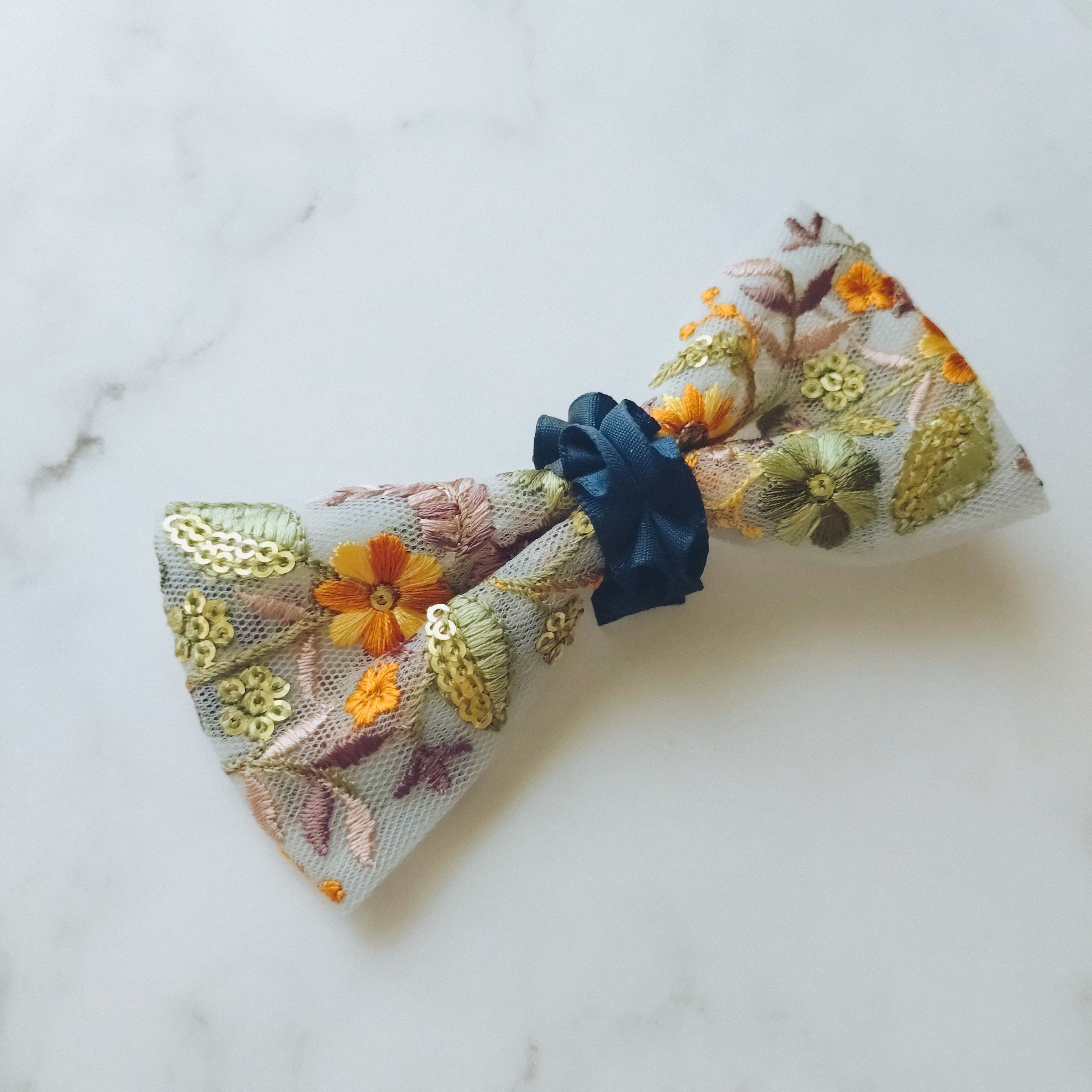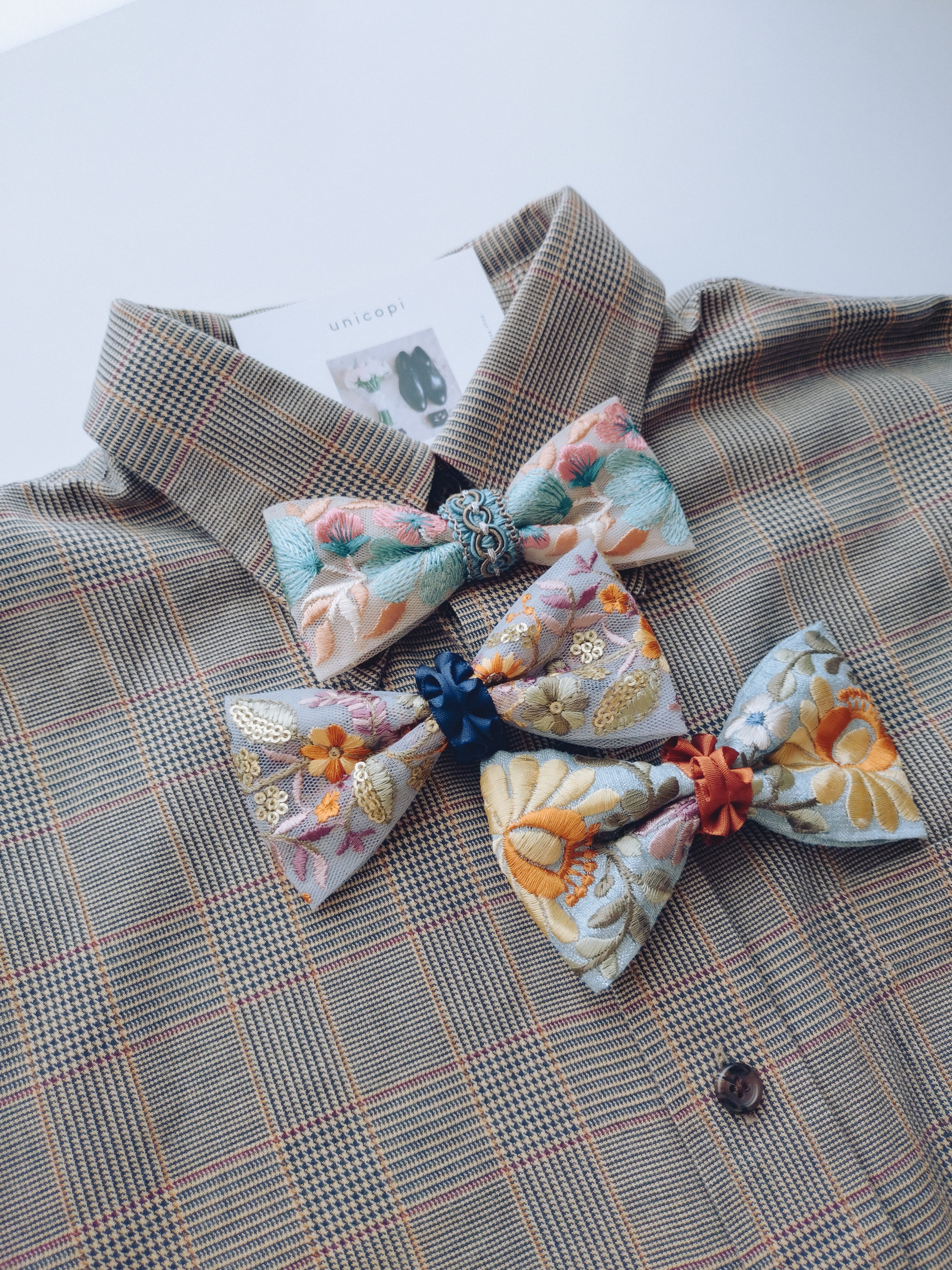 個性的な刺繍を蝶ネクタイにしているため柄の出方が一点一点異なり、唯一無二のtieとなります