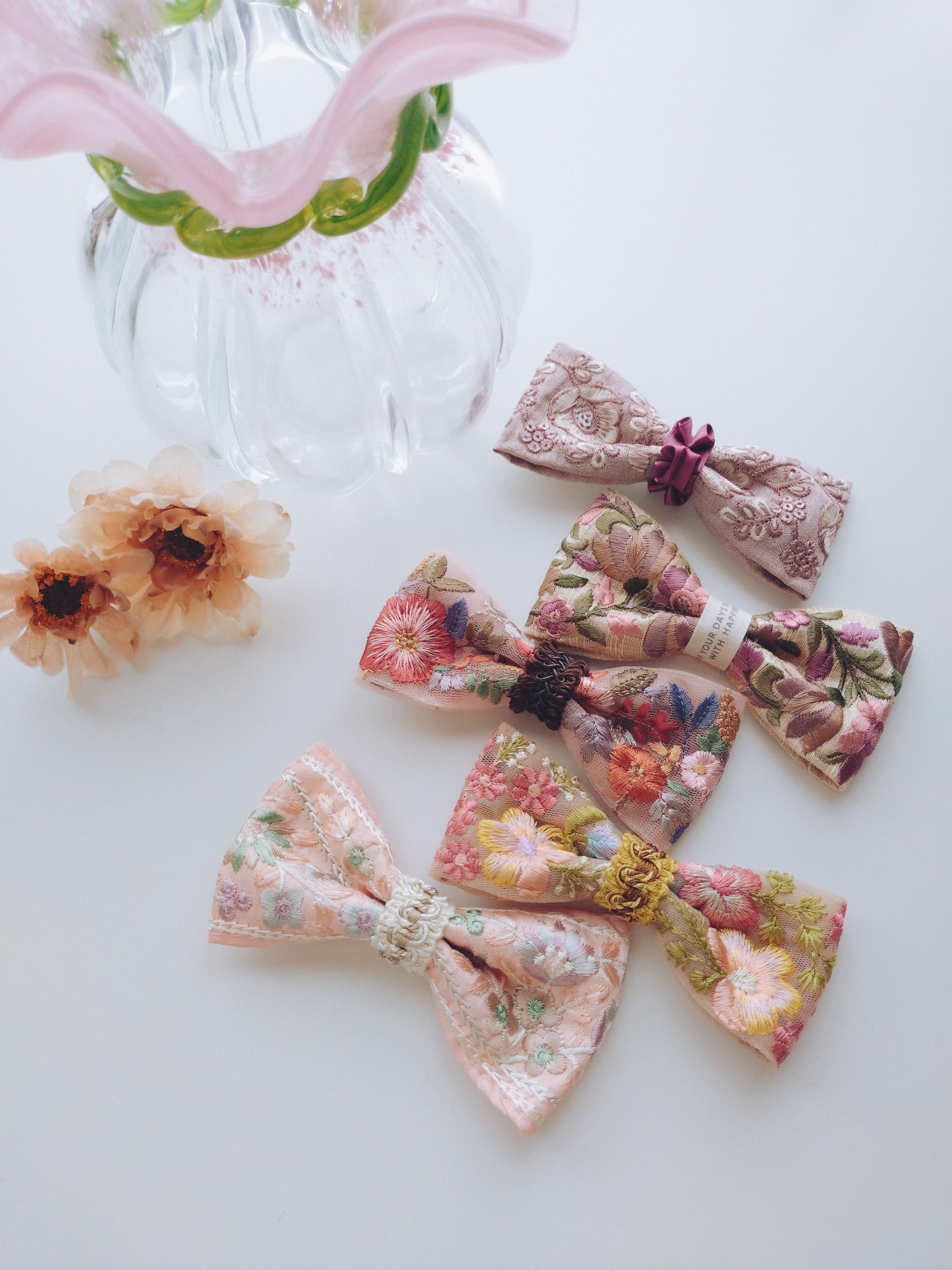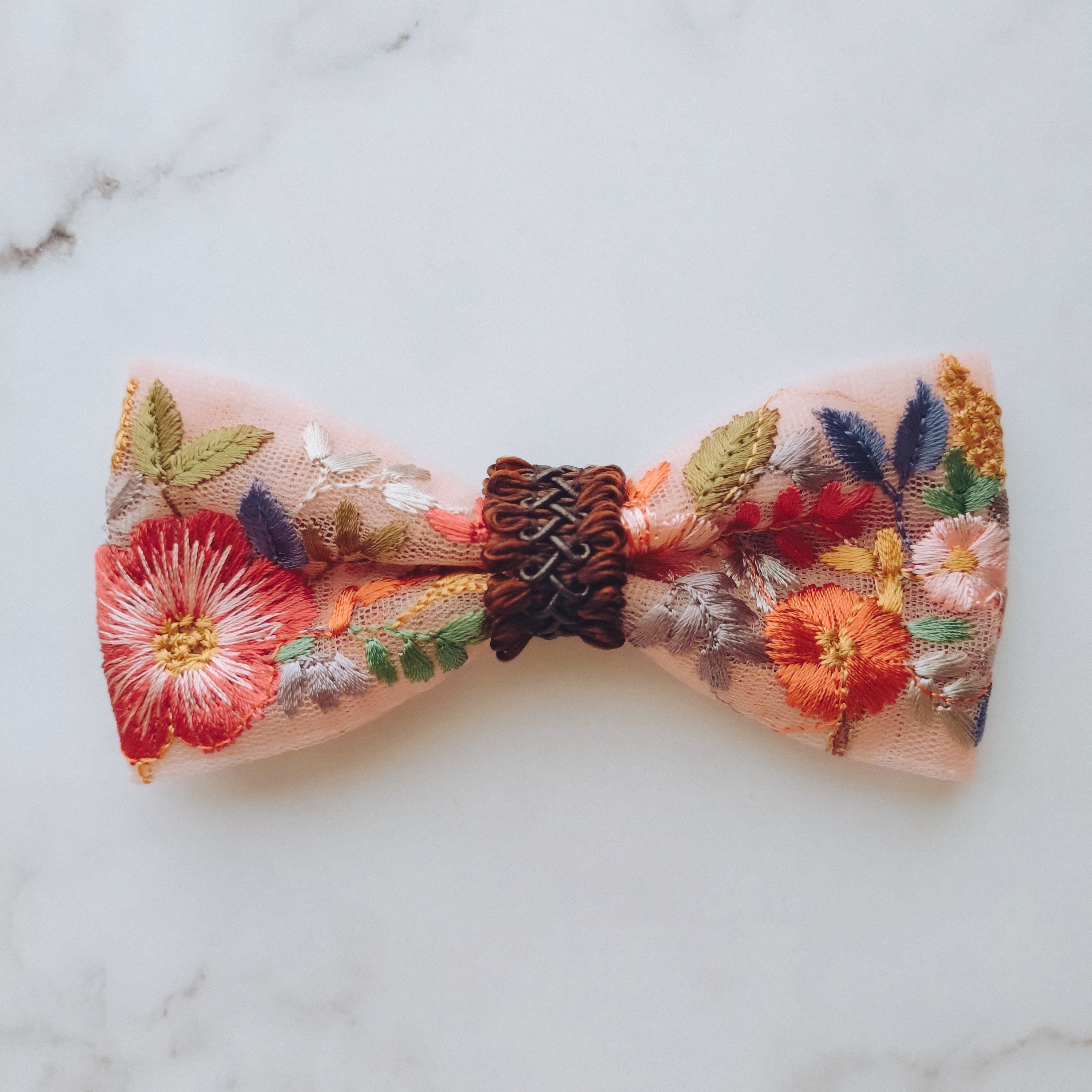 ピンクのチュール生地に南国デザインのようなお花がたくさん刺繍された蝶ネクタイ