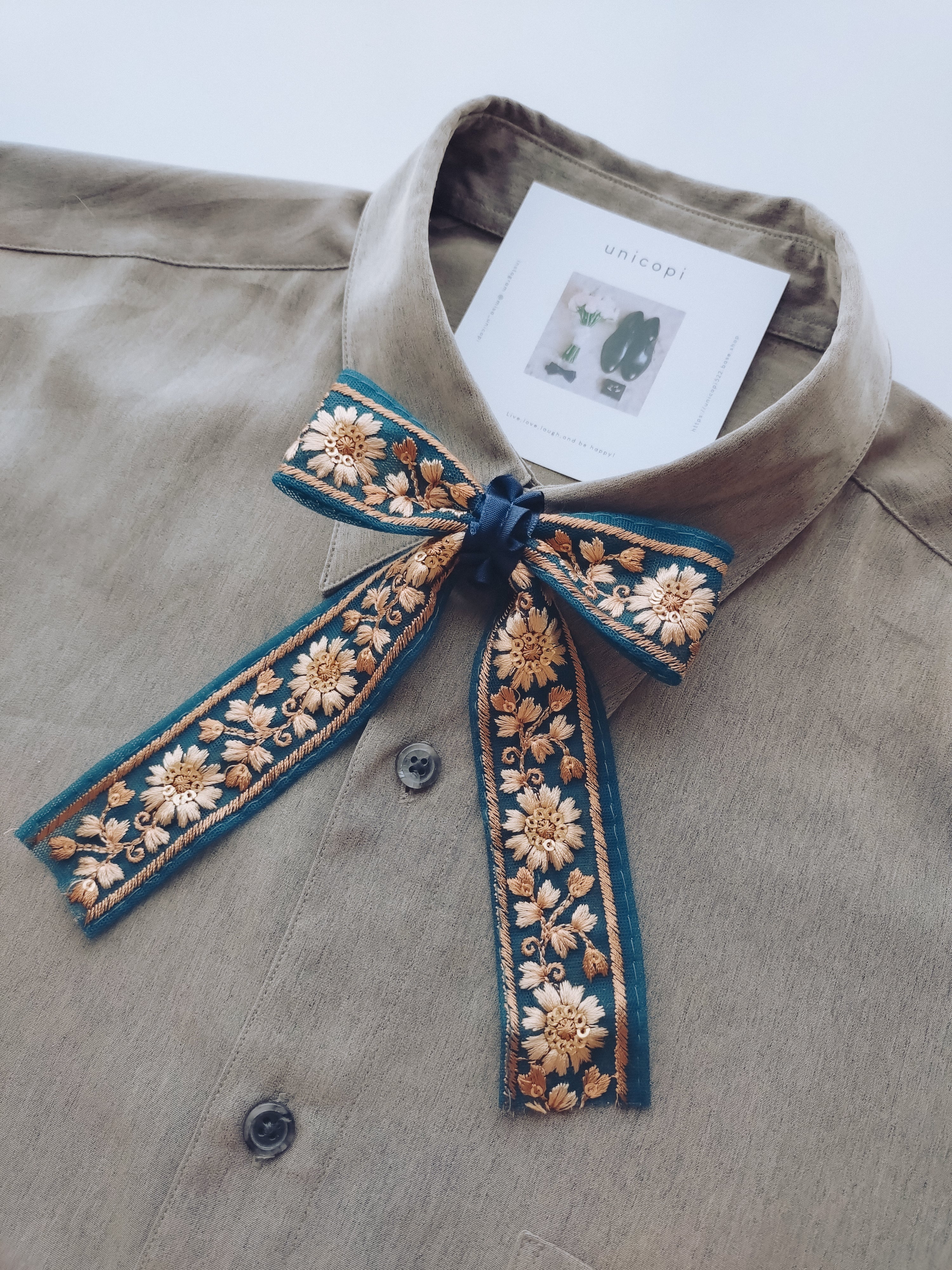 個性的な刺繍を蝶ネクタイにしているため柄の出方が一点一点異なり、唯一無二のtieとなります