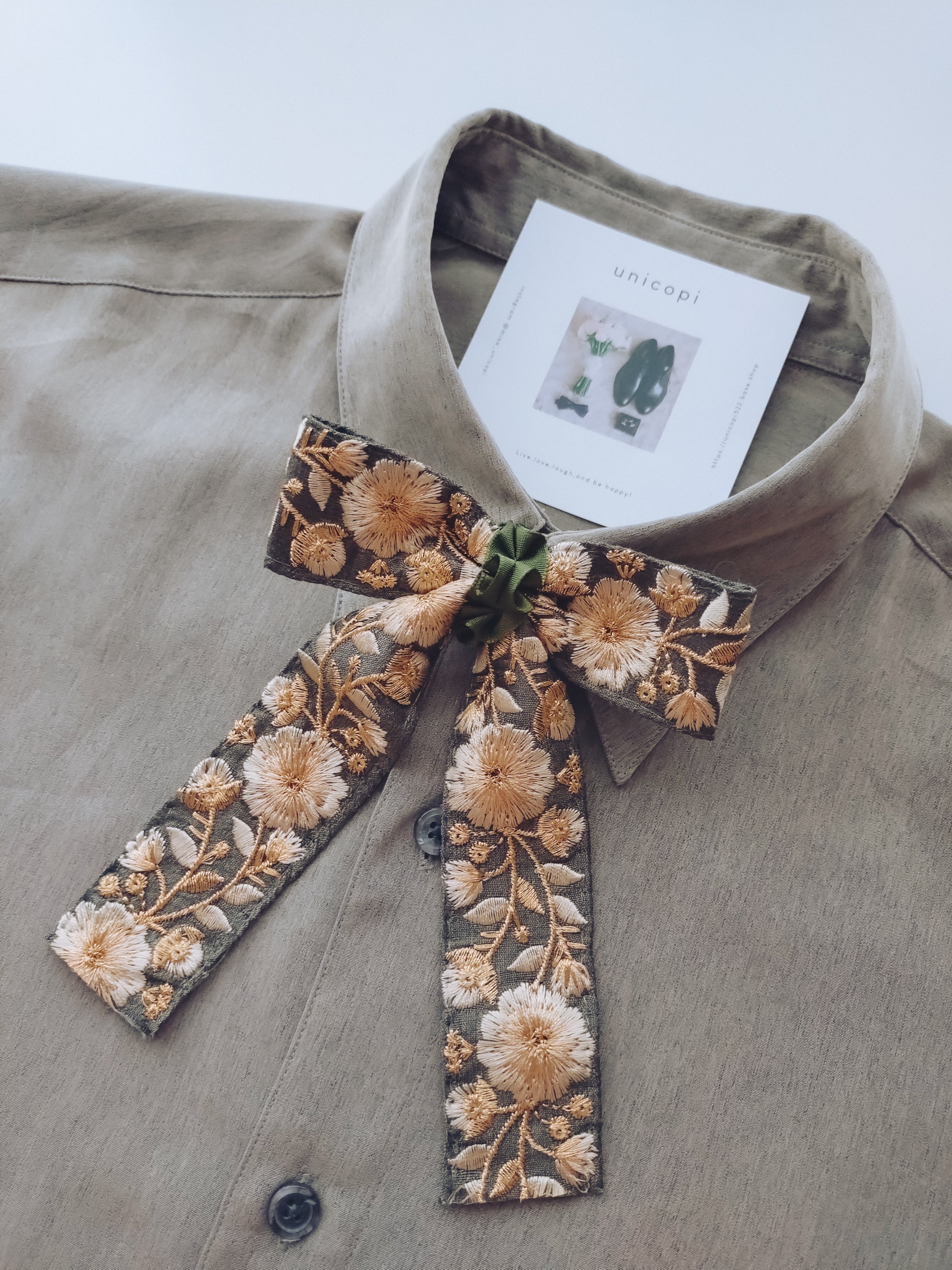 個性的な刺繍を蝶ネクタイにしているため柄の出方が一点一点異なり、唯一無二のtieとなります