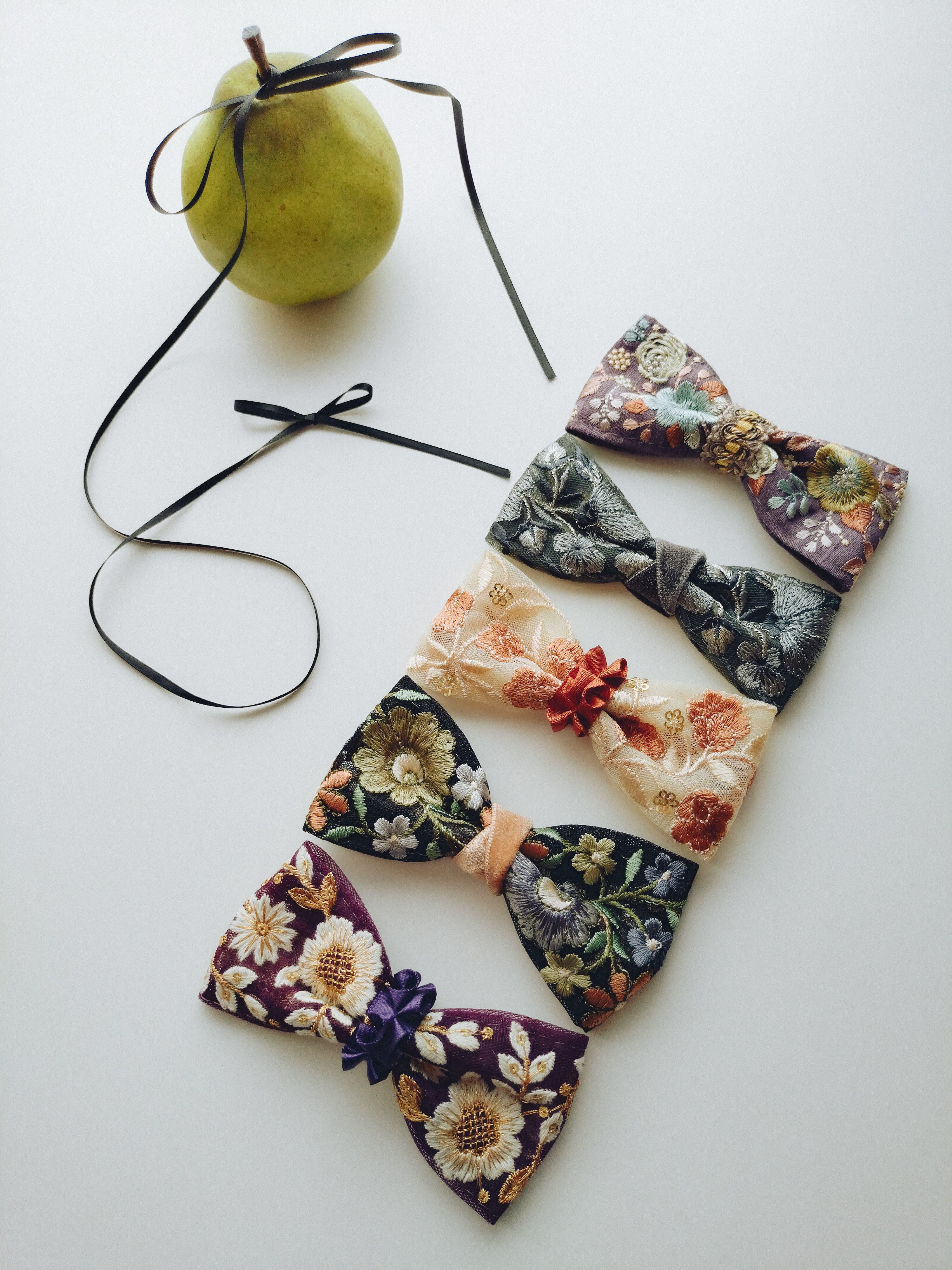 個性的な刺繍を蝶ネクタイにしているため柄の出方が一点一点異なり、唯一無二のtieとなります