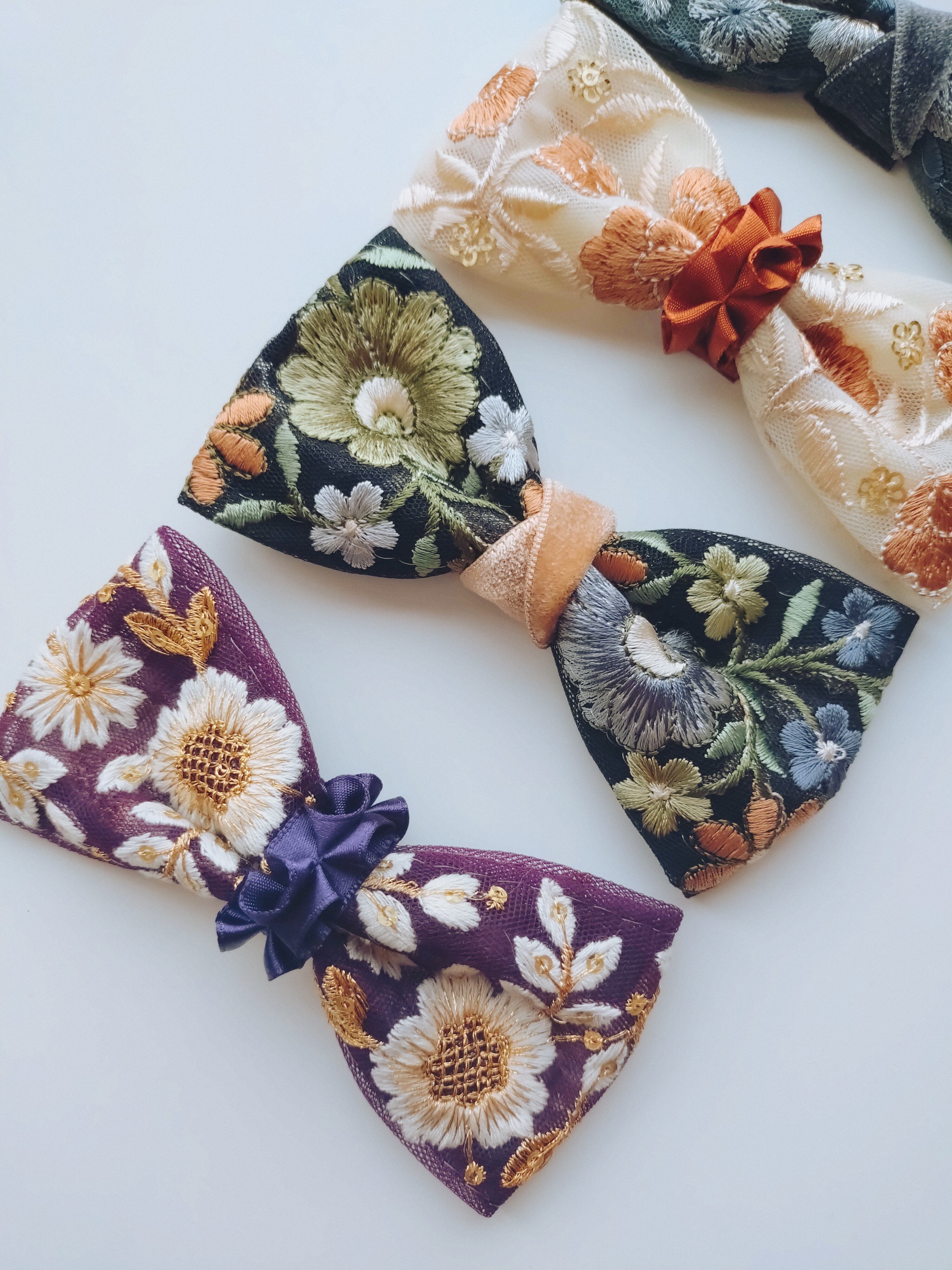 アイボリーカラーのチュール生地に、テラコッタカラーの刺繍が鮮やかな蝶ネクタイ