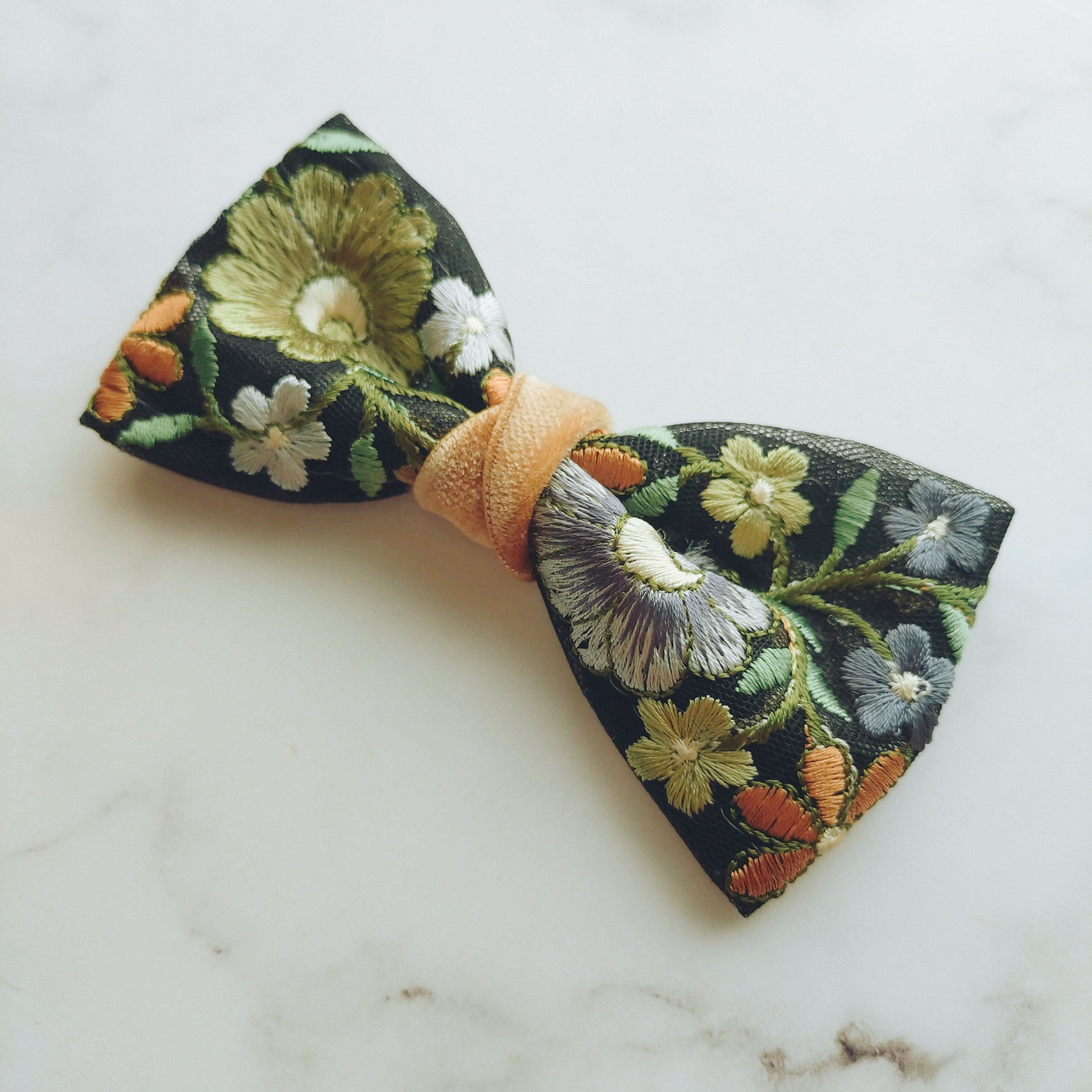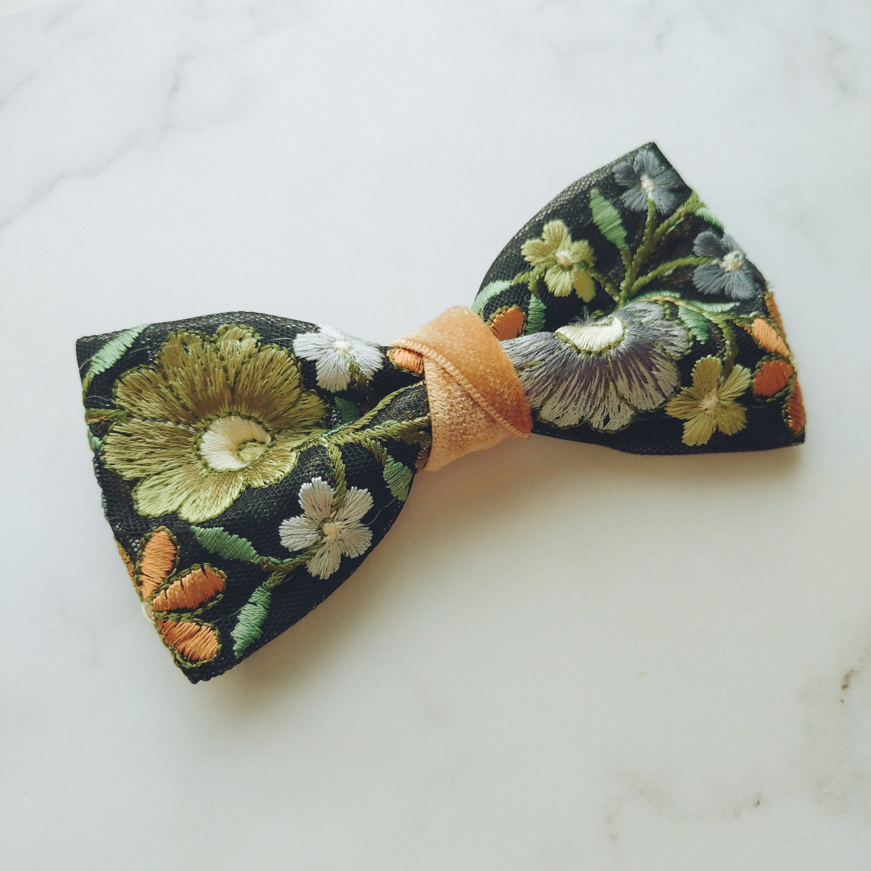 ブラックベースの生地にグリーンやブルーの刺繍が目を引く蝶ネクタイ