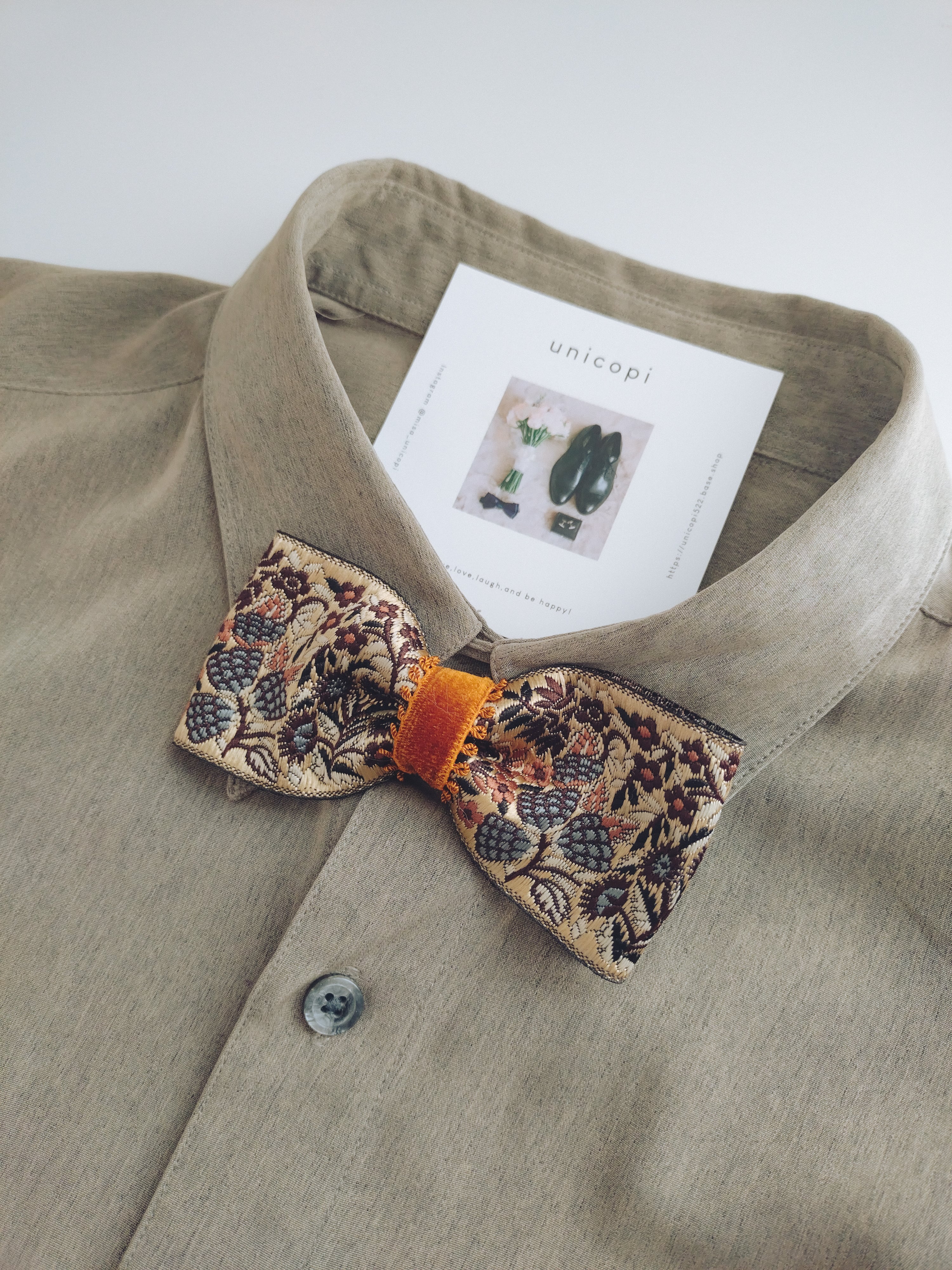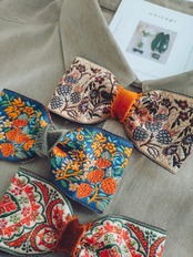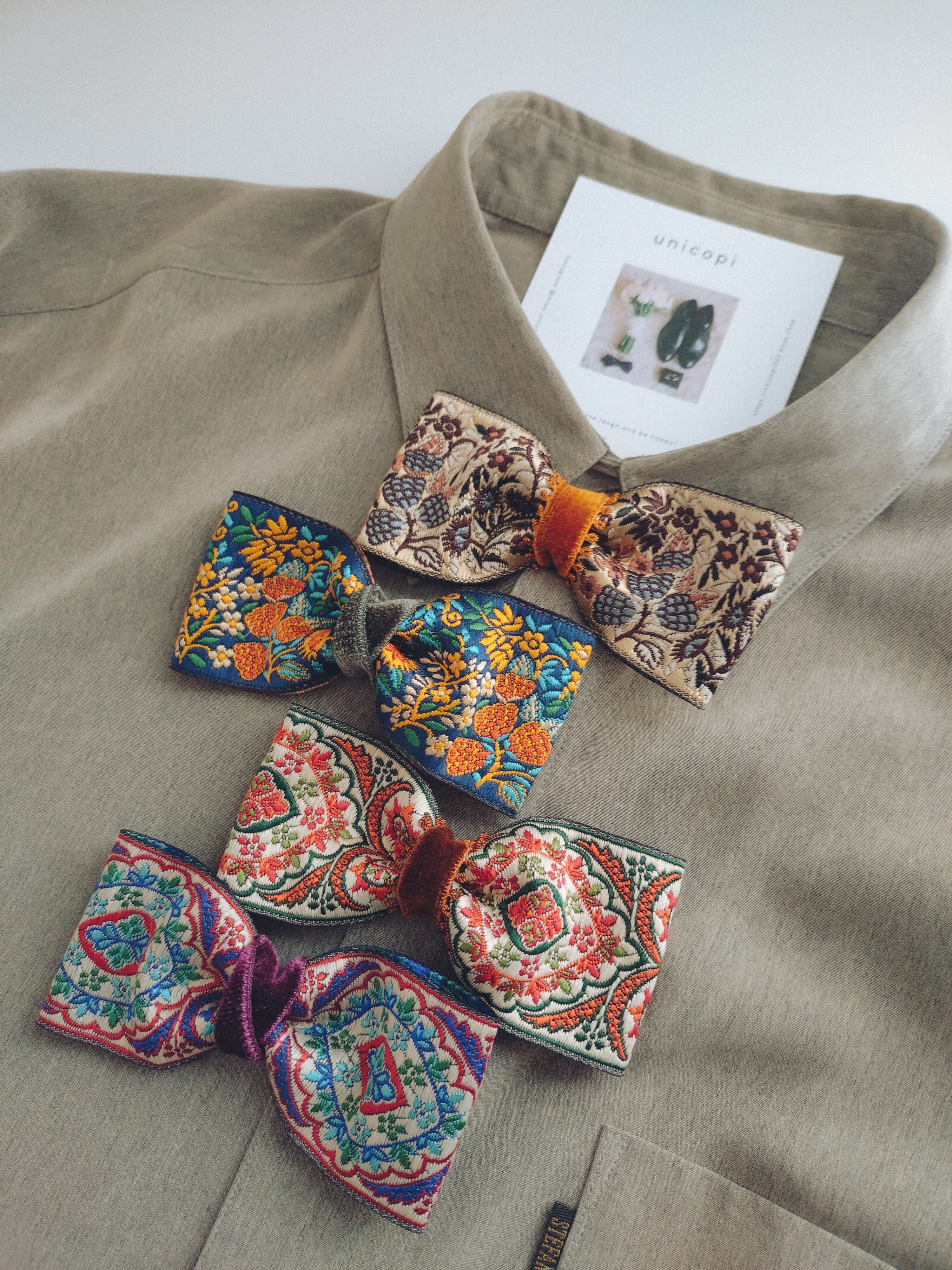 個性的な刺繍を蝶ネクタイにしているため柄の出方が一点一点異なり、唯一無二のtieとなります