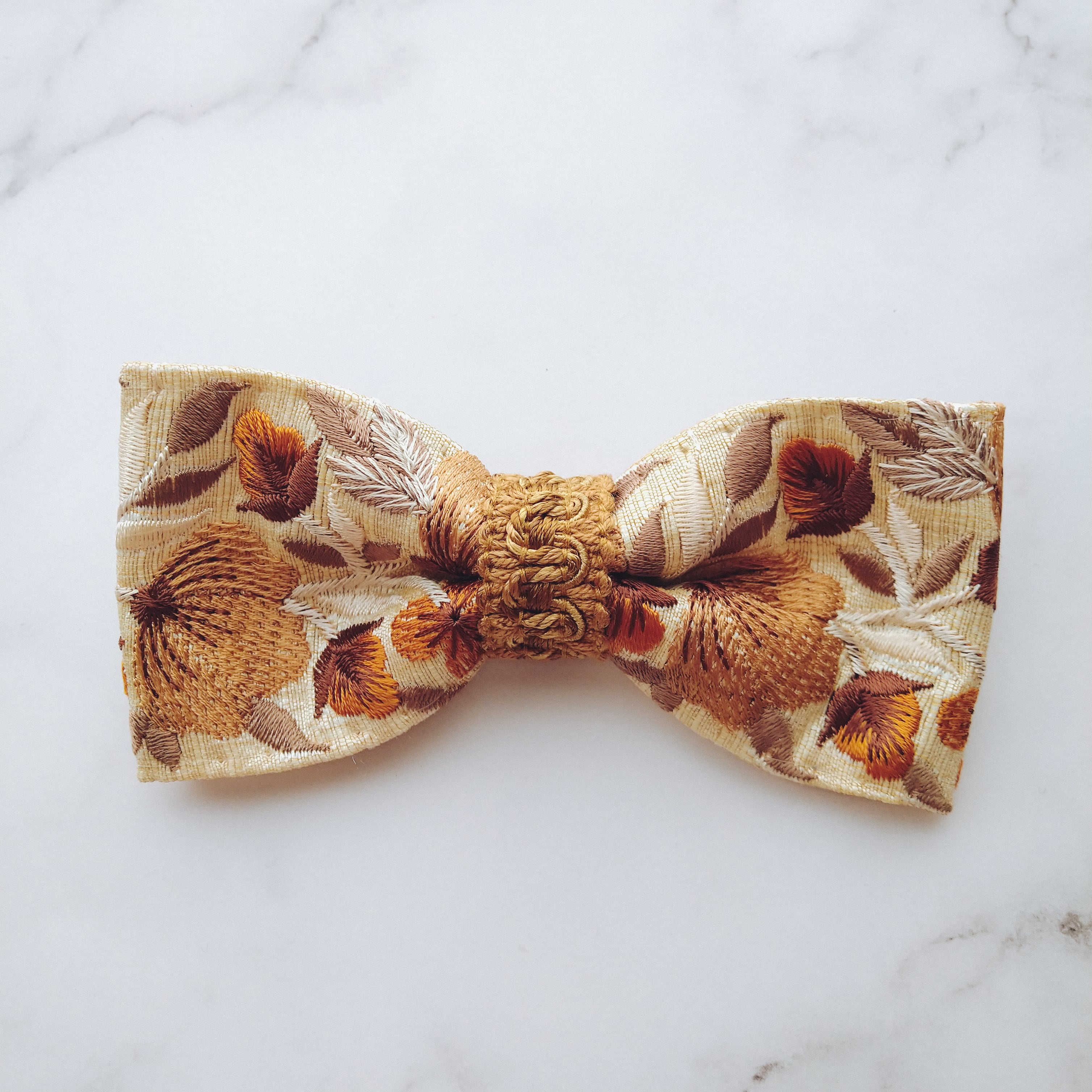 ブラウンやベージュの刺繍が施されたどんなカラーのタキシードにも合わせやすいインド刺繍蝶ネクタイ