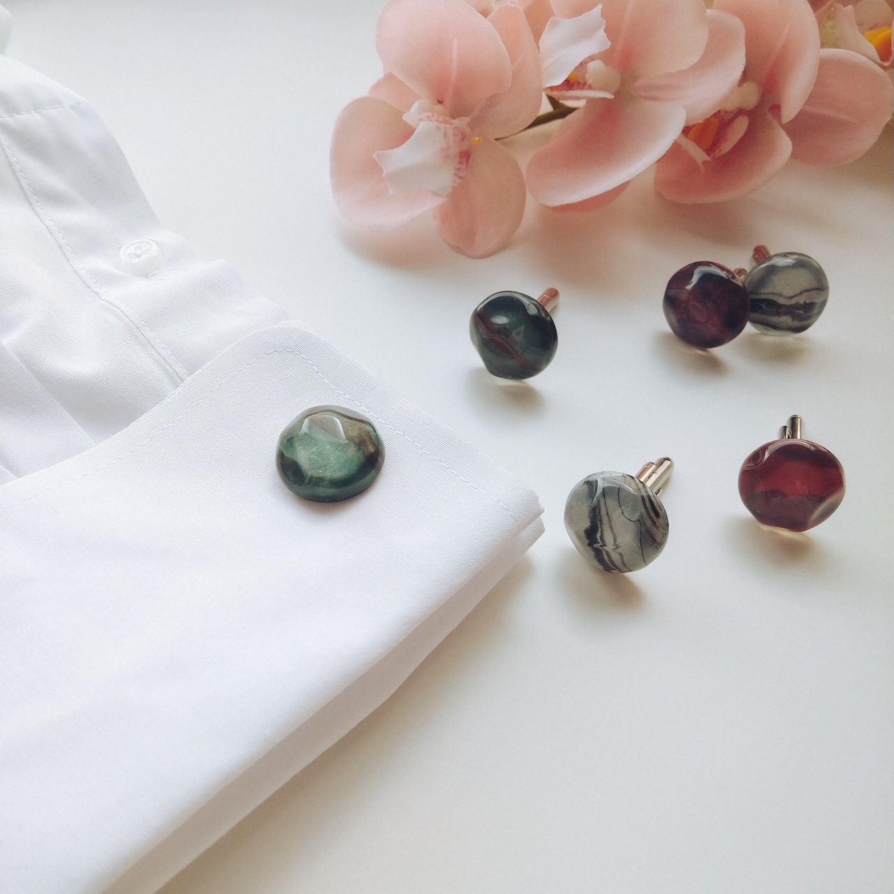 カフリンクスの場合はジャケットを脱ぐお色直しや前撮りなど、おしゃれのワンポイントとして着用いただけます(カフス穴のあるシャツをご利用ください)