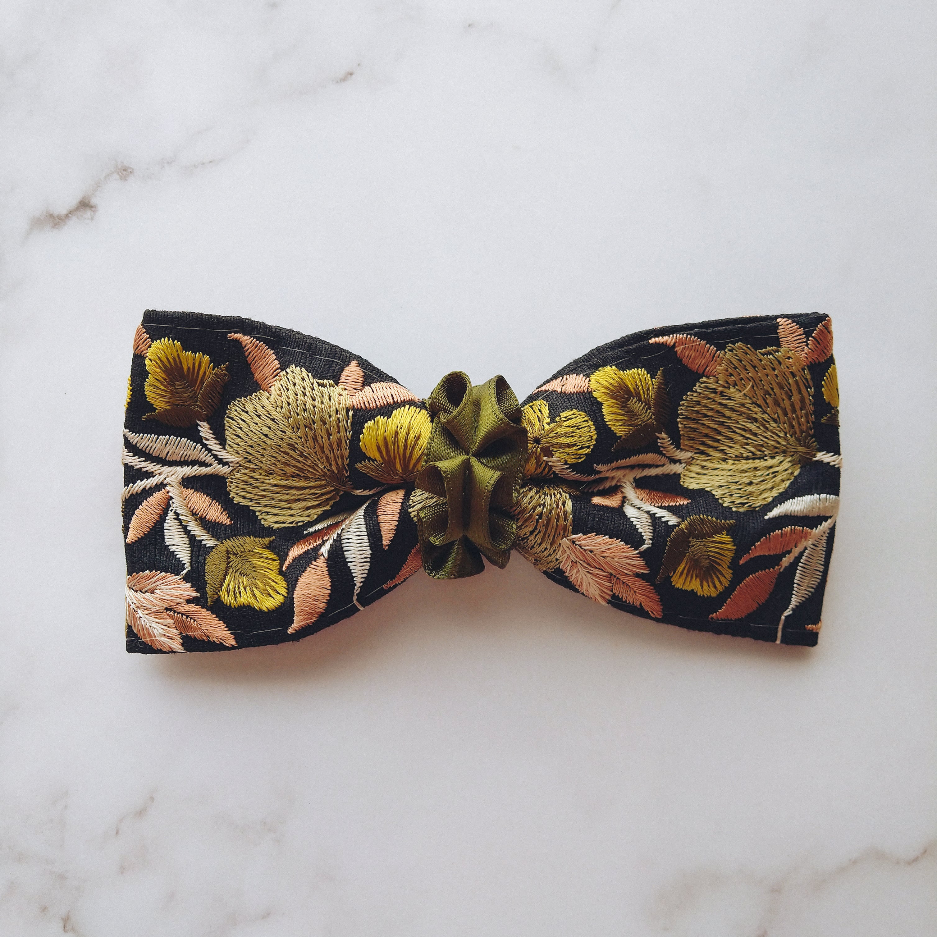 ブラックベースのシルク生地にグリーンの刺繍が鮮やかな蝶ネクタイ