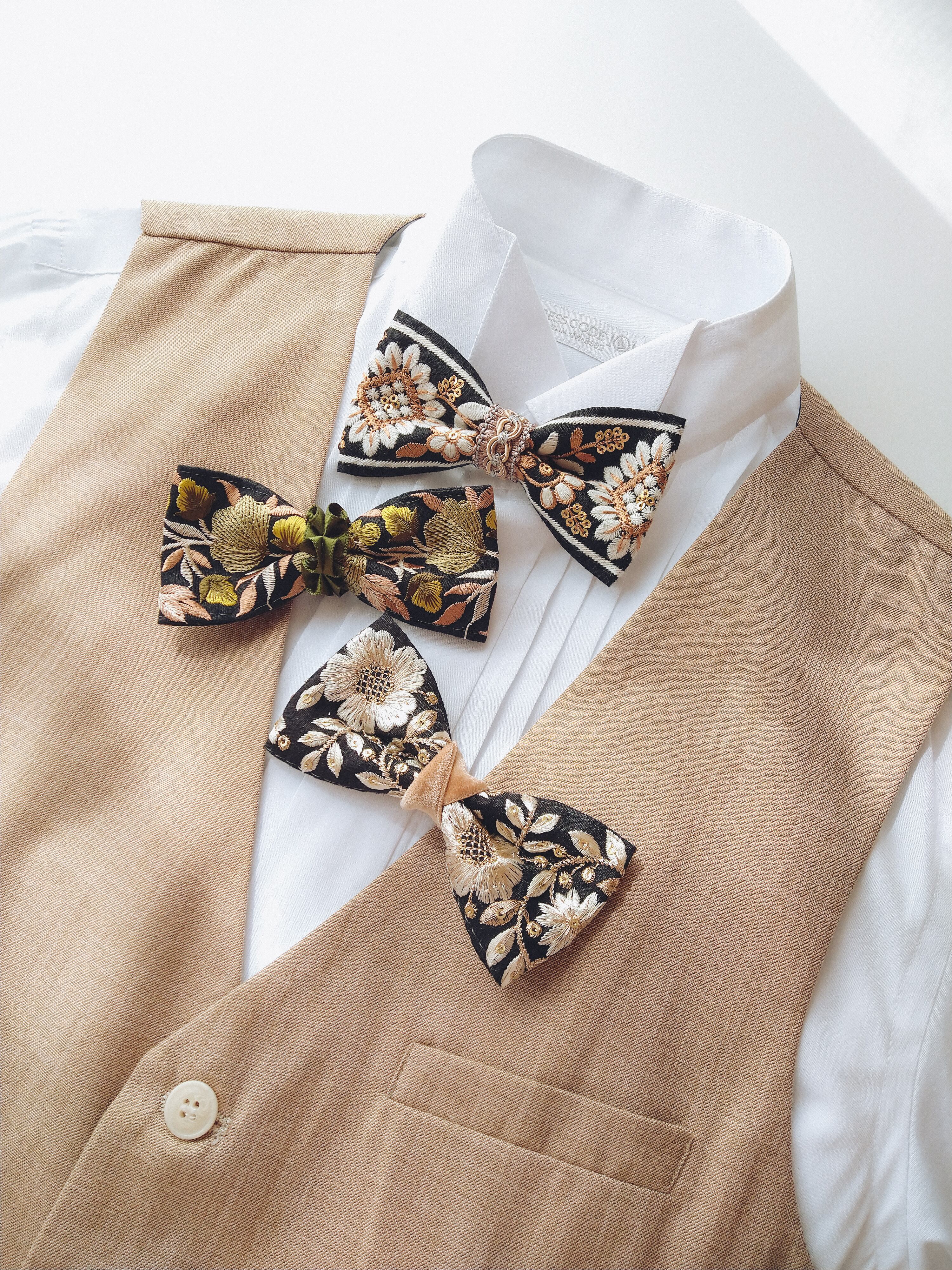 個性的な刺繍を蝶ネクタイにしているため柄の出方が一点一点異なり、唯一無二のtieとなります