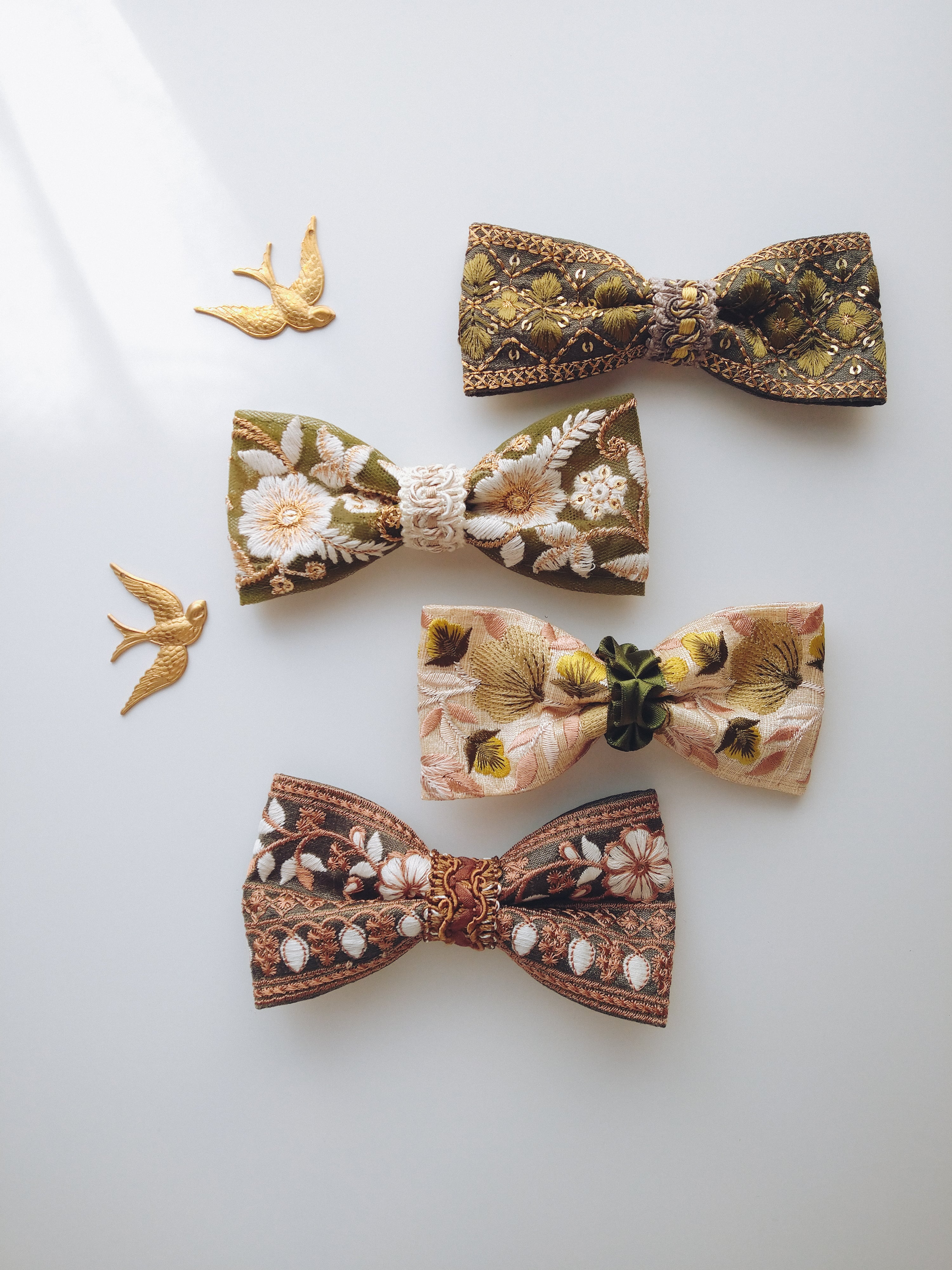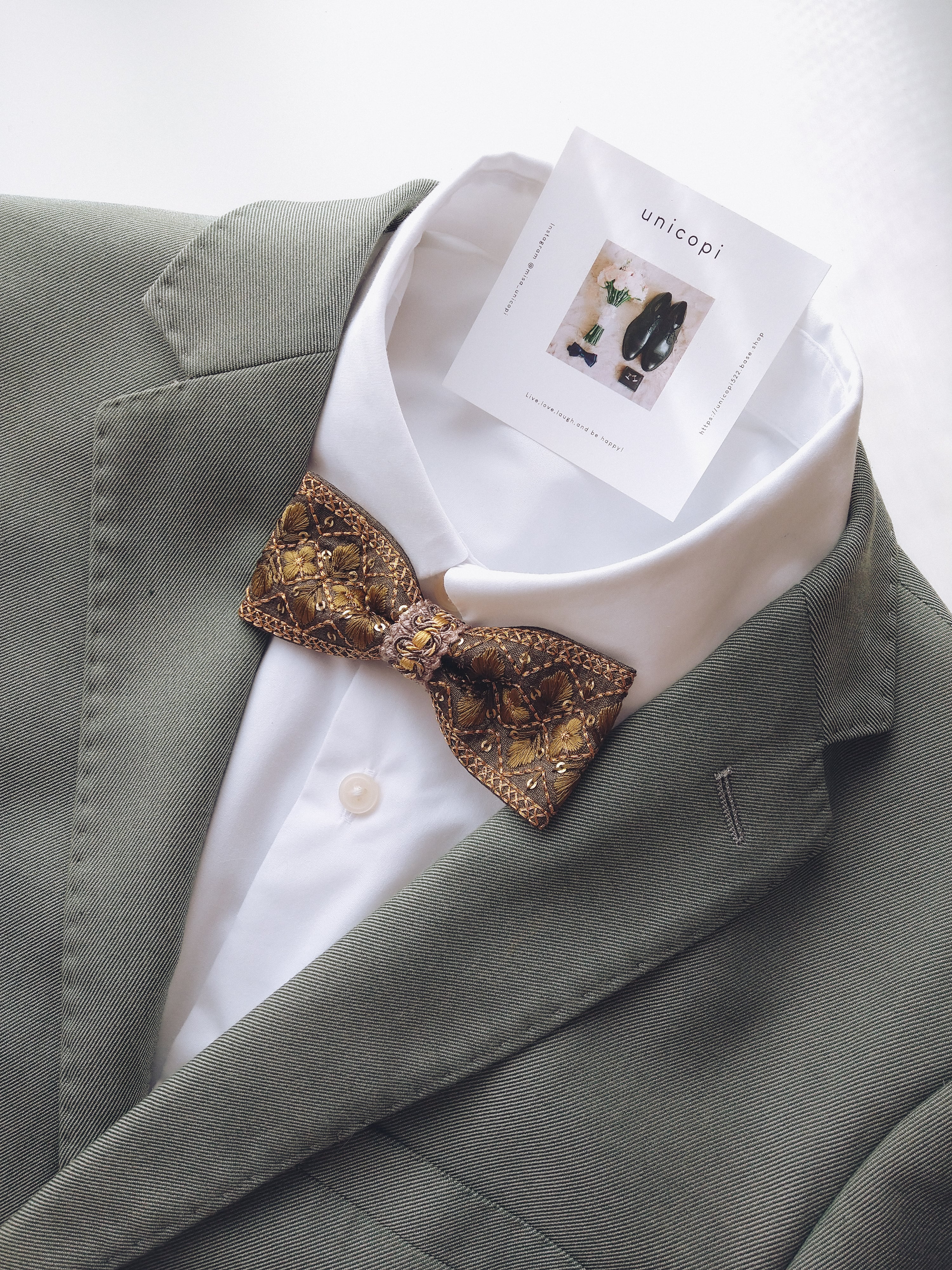 個性的な刺繍を蝶ネクタイにしているため柄の出方が一点一点異なり、唯一無二のtieとなります