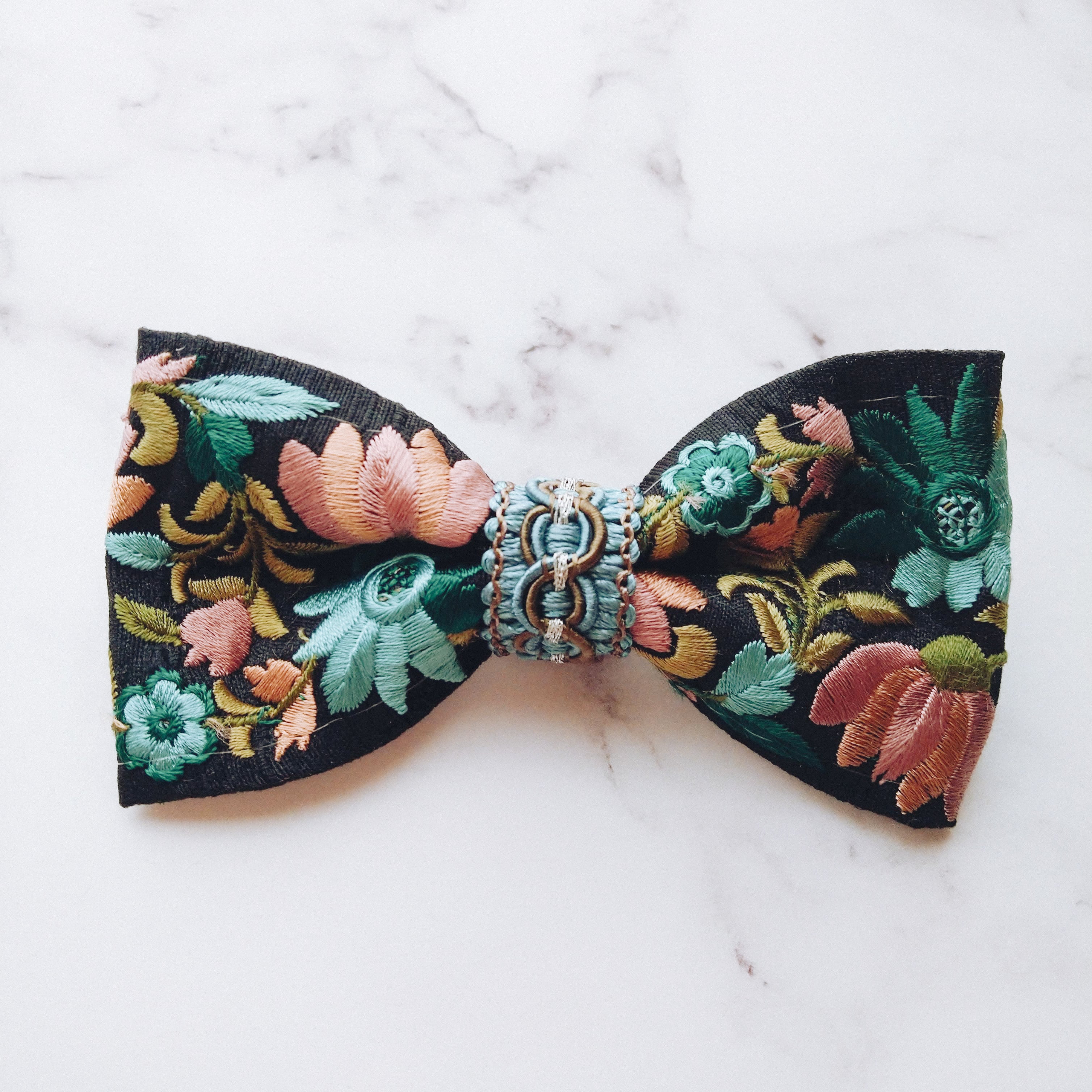 ブラックベースの生地にブルーやライトピンクのフラワー刺繍が鮮やかな個性派蝶ネクタイ