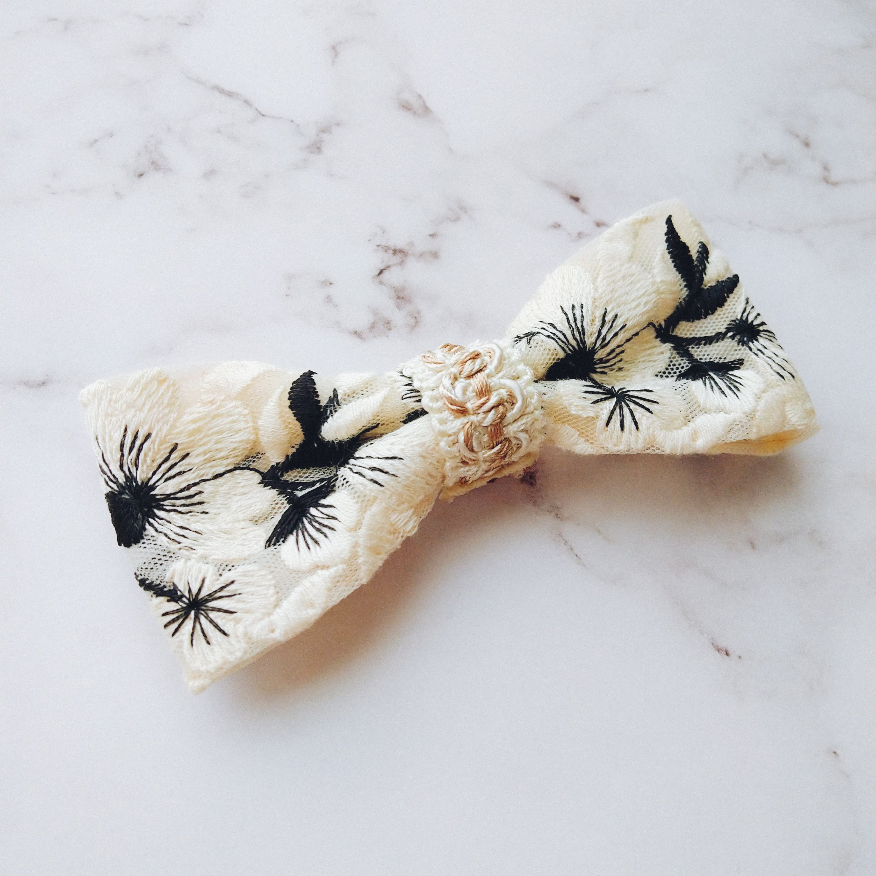 軽やかな印象のオフホワイトのチュール生地にブラックのフラワーが描かれたモノクロ蝶ネクタイ