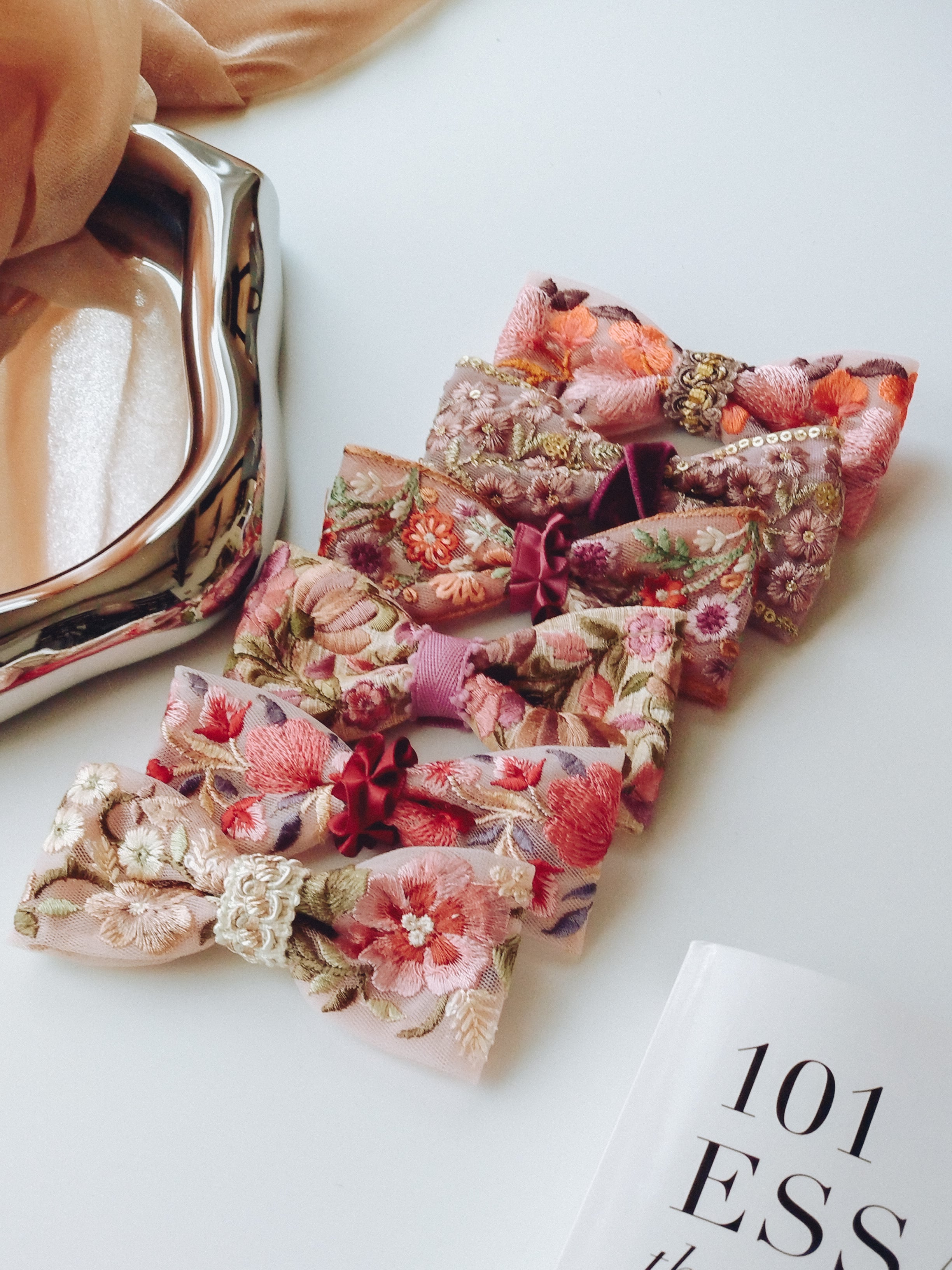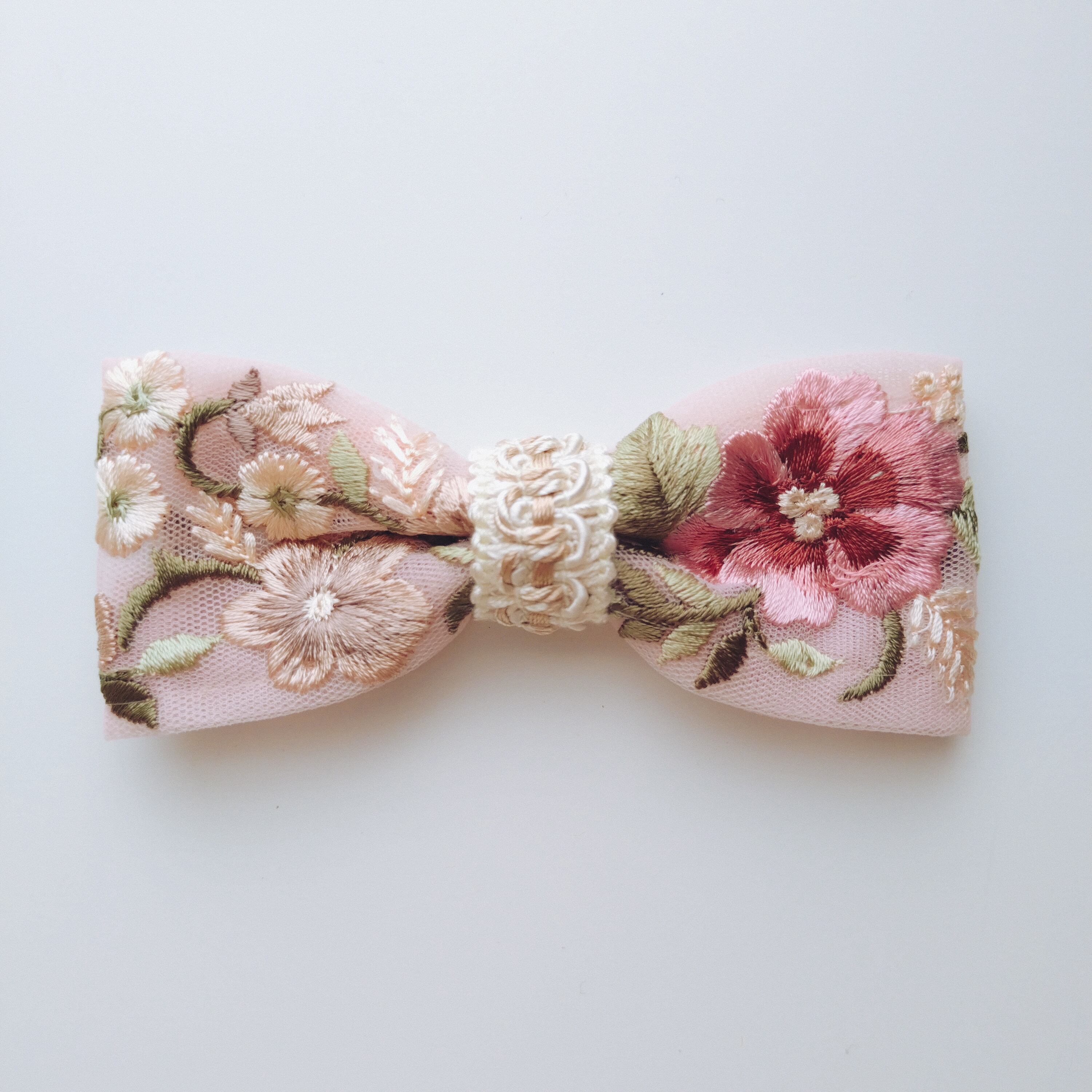 やわらかな印象のパステルピンクのチュール生地にフラワー刺繍がワンポイントになるボタニカルな蝶ネクタイ