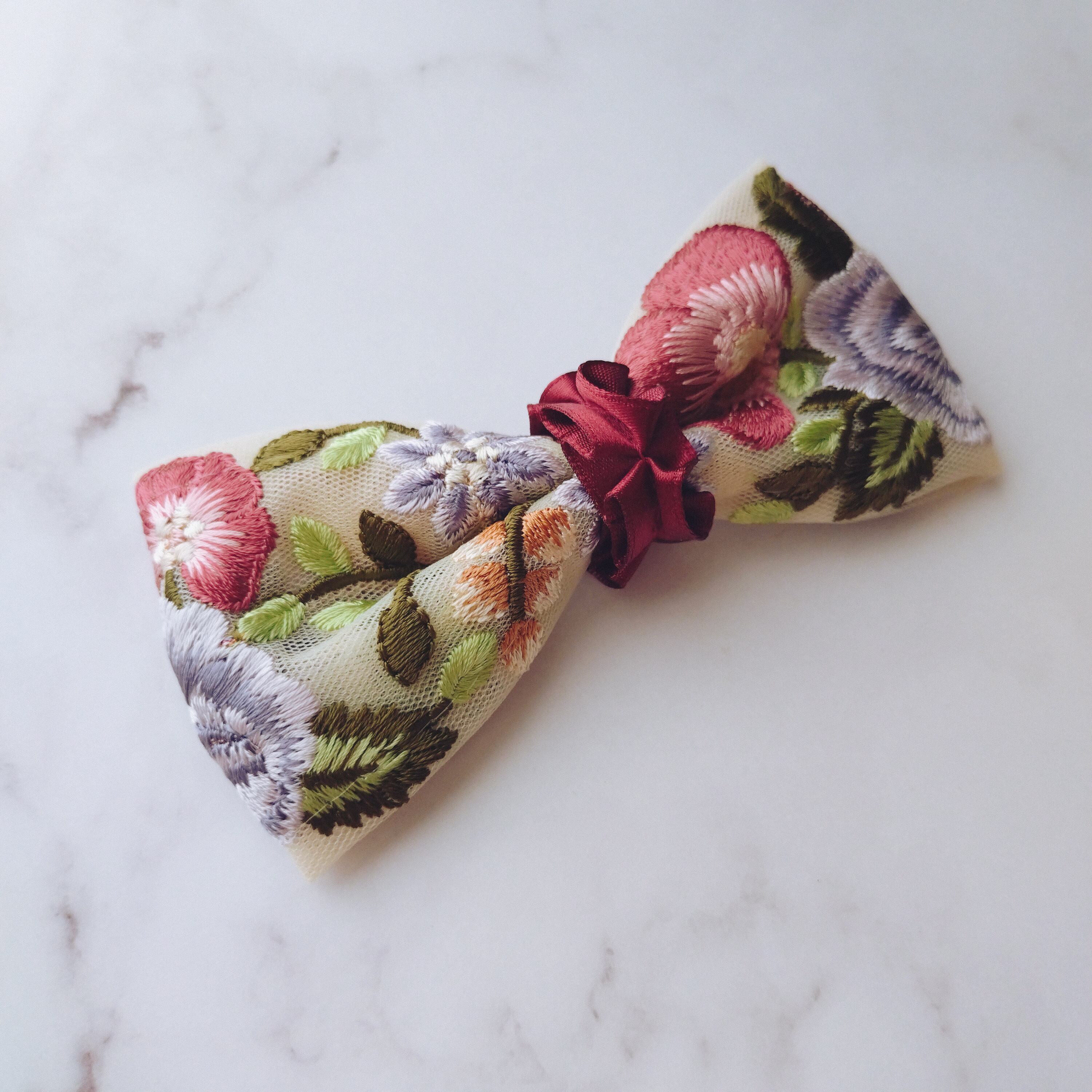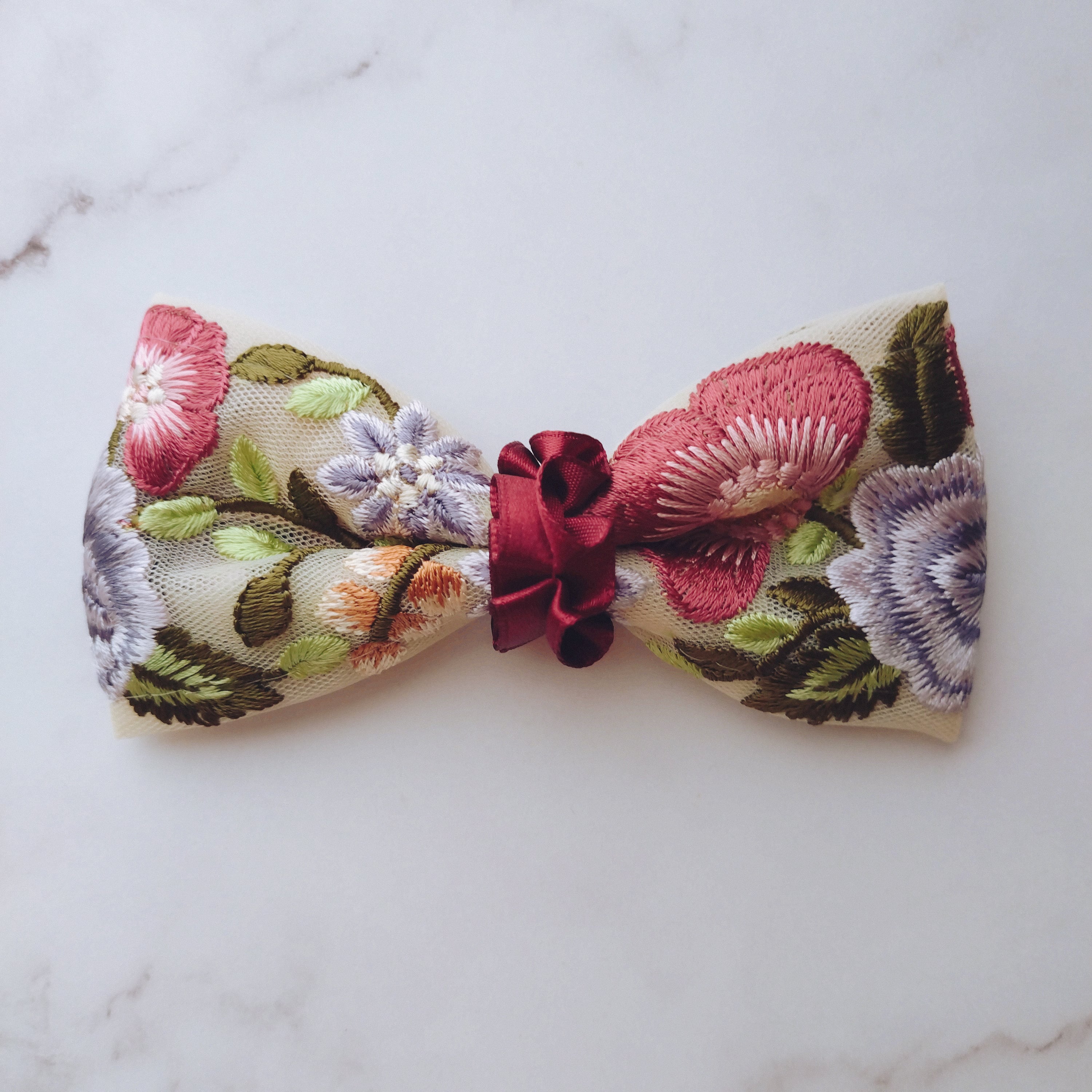 鮮やかなレッドピンクのフラワー刺繍が際立つ蝶ネクタイ