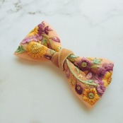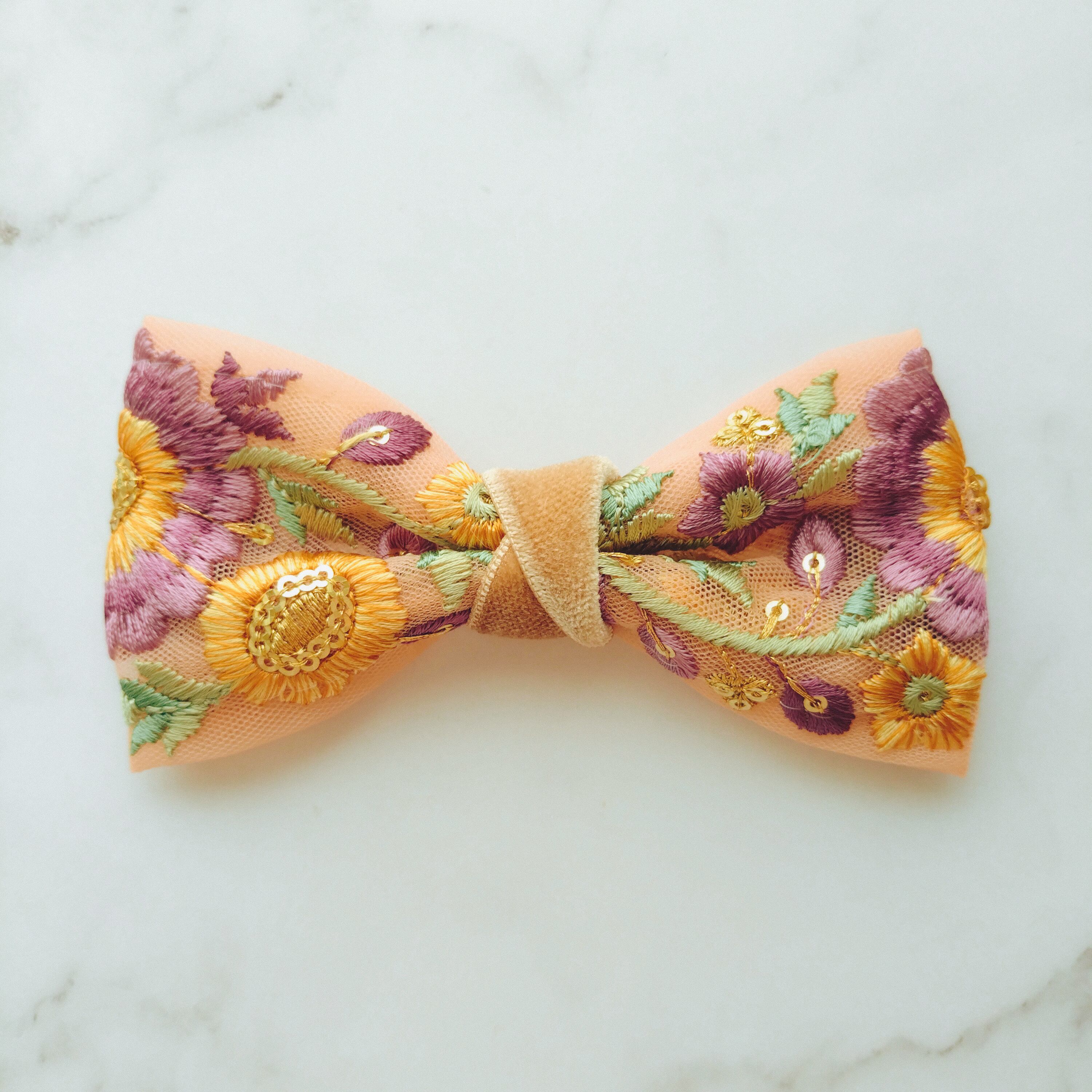 サーモンピンクとオレンジの間のような絶妙なカラーのチュール生地にイエロー&パープルのフラワー刺繍が施された鮮やかでちょっぴりレトロなインド刺繍蝶ネクタイ