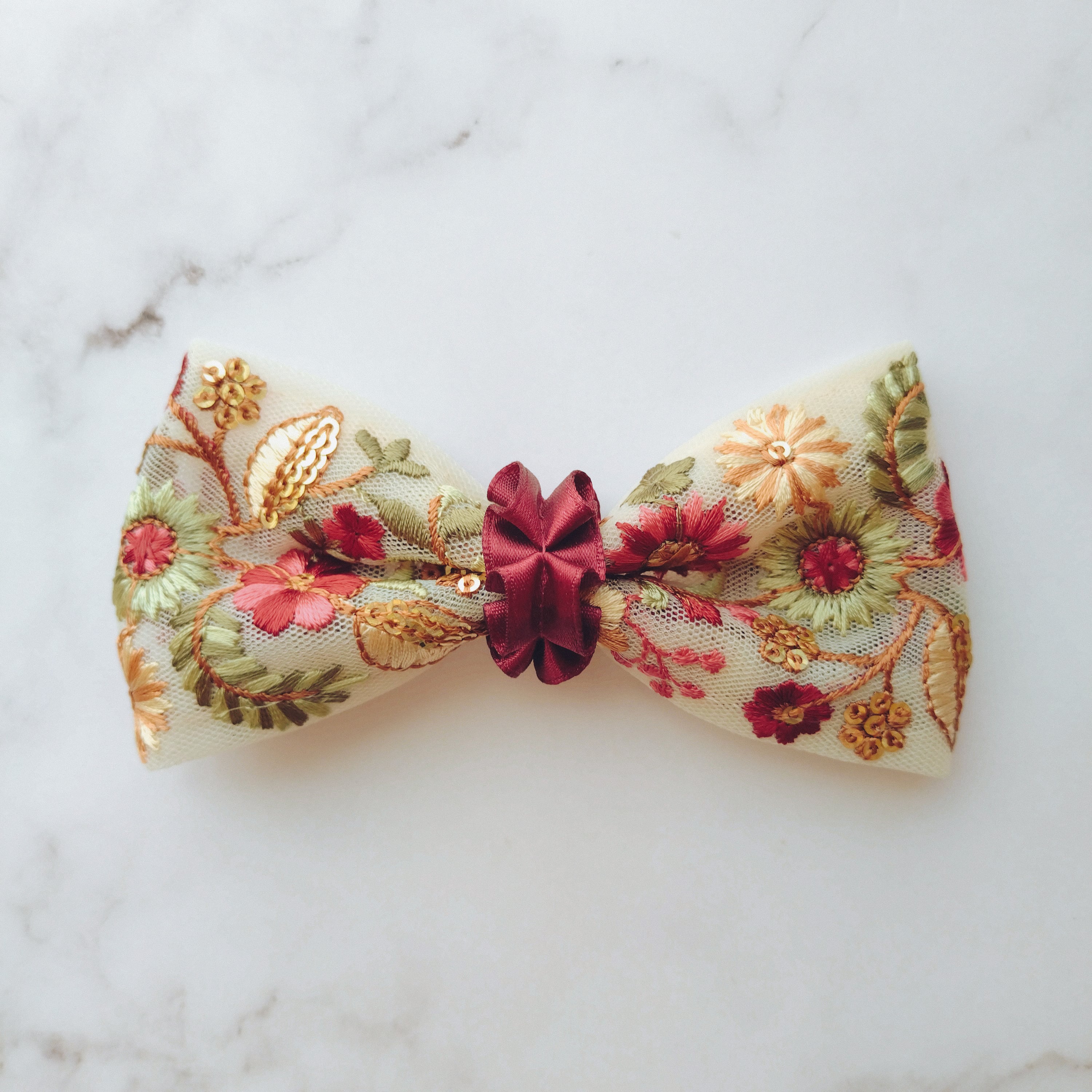 淡いベージュのチュール生地にレッドやグリーンの小花柄刺繍が紅葉のはじまりを知らせてくれるような蝶ネクタイです