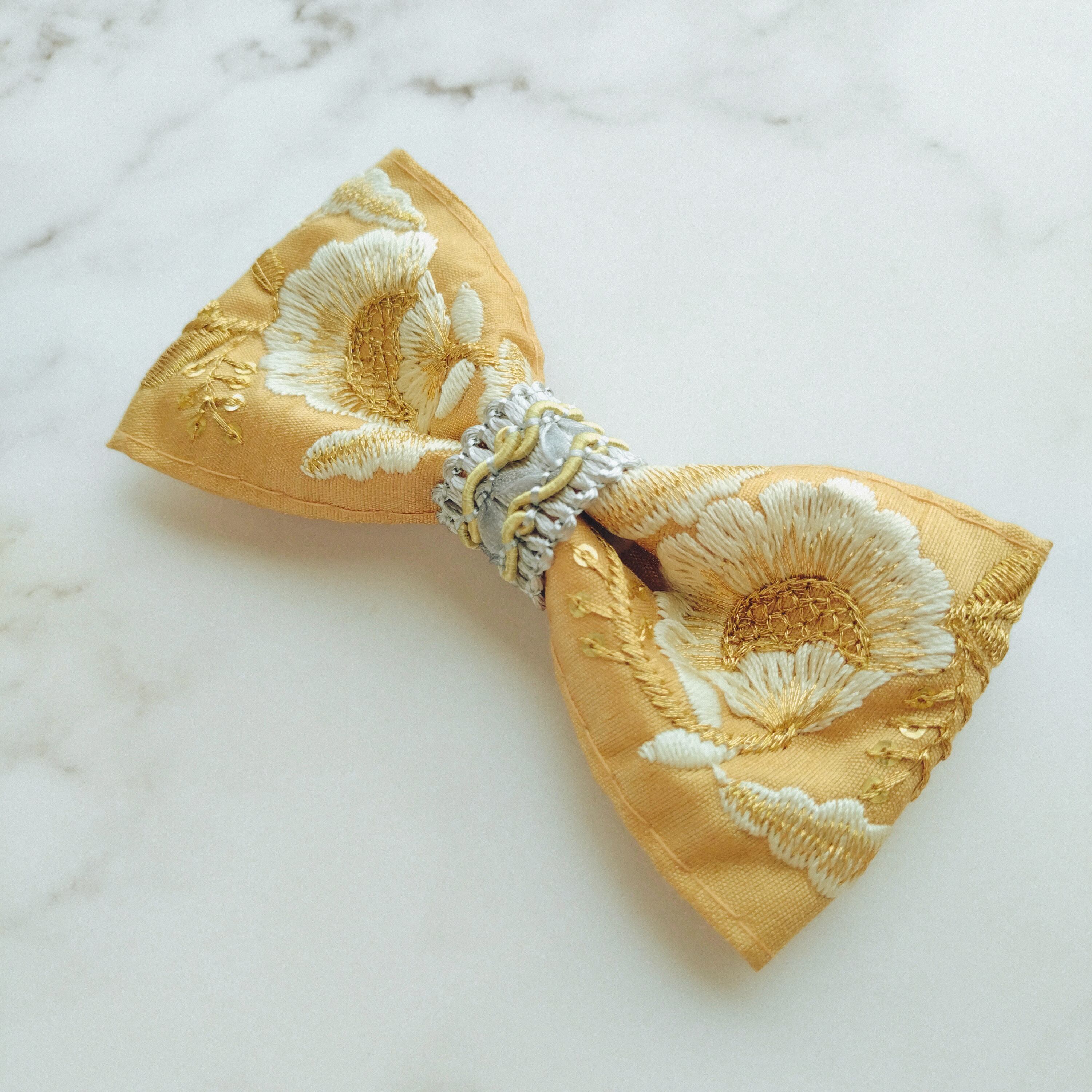 明るいイエローゴールドの生地にキラキラと輝くホワイト&ゴールドの刺繍が美しい蝶ネクタイです