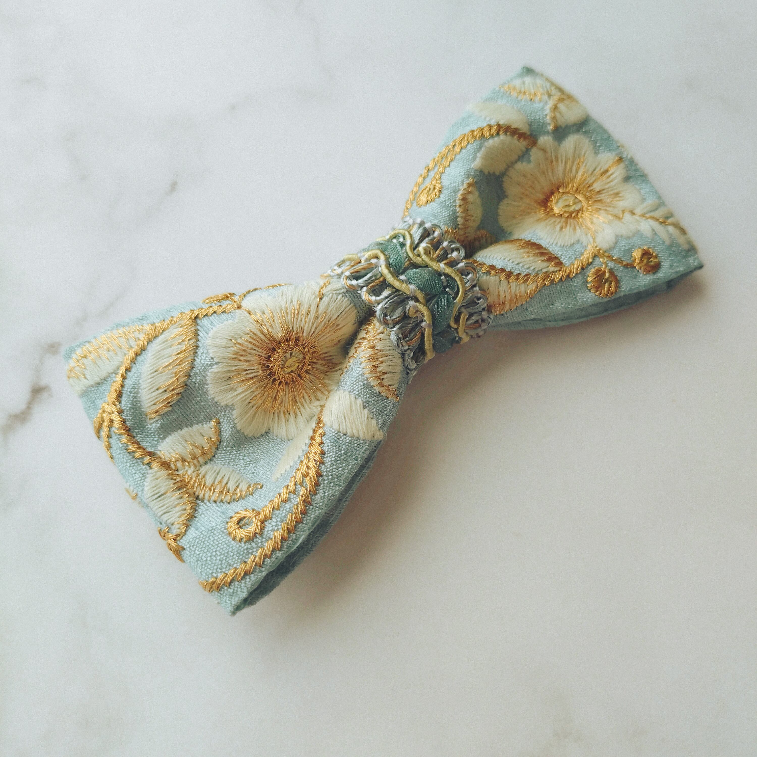 デニムのようなライトブルーにホワイトのフラワー刺繍やゴールド刺繍が光り輝く爽やかかつ華やかなインド刺繍蝶ネクタイ